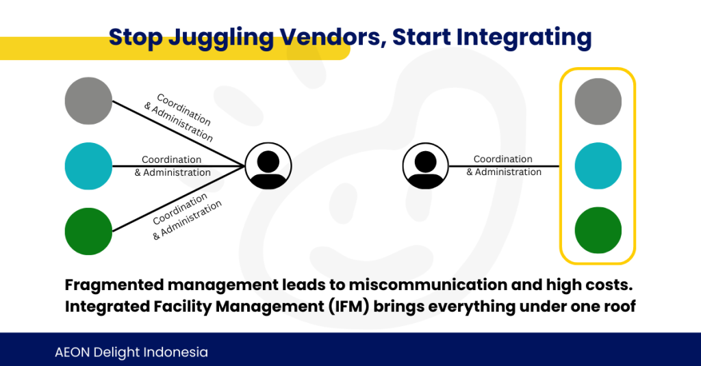End-to-end facility management, yang sering disebut sebagai Integrated Facility Management (IFM), merupakan pendekatan pengelolaan layanan gedung yang dilakukan secara lebih terhubung dan terorganisir. Alih-alih bekerja dengan banyak vendor terpisah untuk layanan kebersihan, pemeliharaan, keamanan, dan layanan teknis, organisasi bermitra dengan satu penyedia untuk mengoordinasikan seluruh layanan tersebut dalam satu kerangka kerja terpadu.