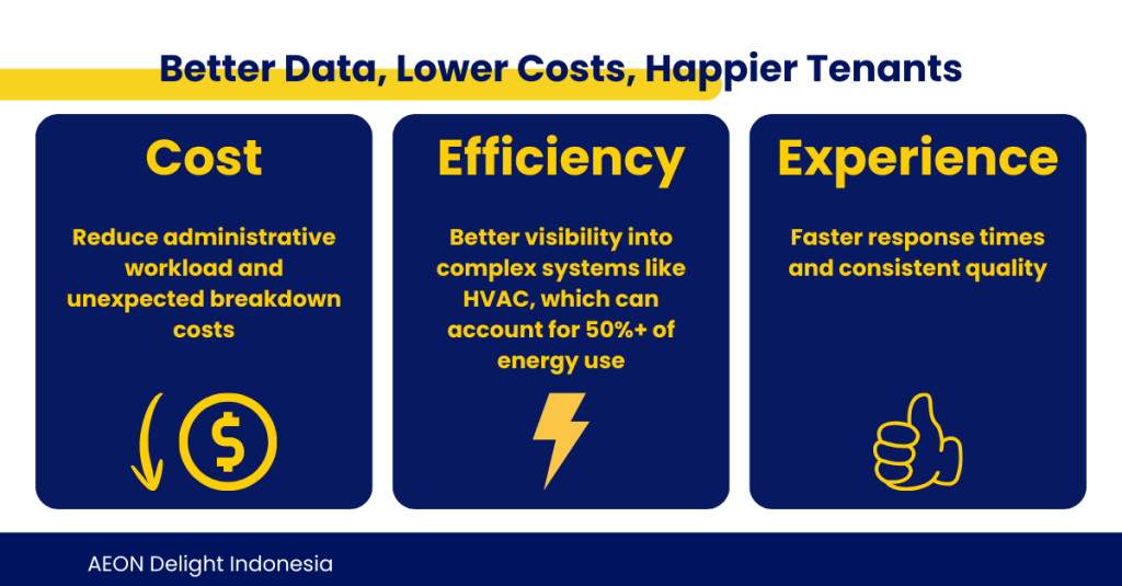 Manfaat integrasi paling terasa pada fasilitas dengan sistem yang kompleks. Gedung komersial berskala besar sangat bergantung pada koordinasi yang erat antara tim mekanikal, elektrikal, kebersihan, dan keselamatan agar operasional berjalan dengan stabil dan efisien.