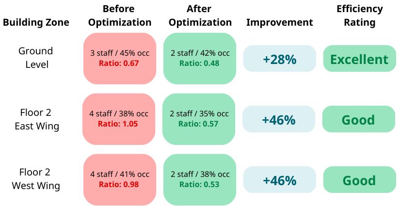 Penempatan SDM / Staffing Optimization: Memastikan staf yang ditugaskan proporsional terhadap aktivitas dan area